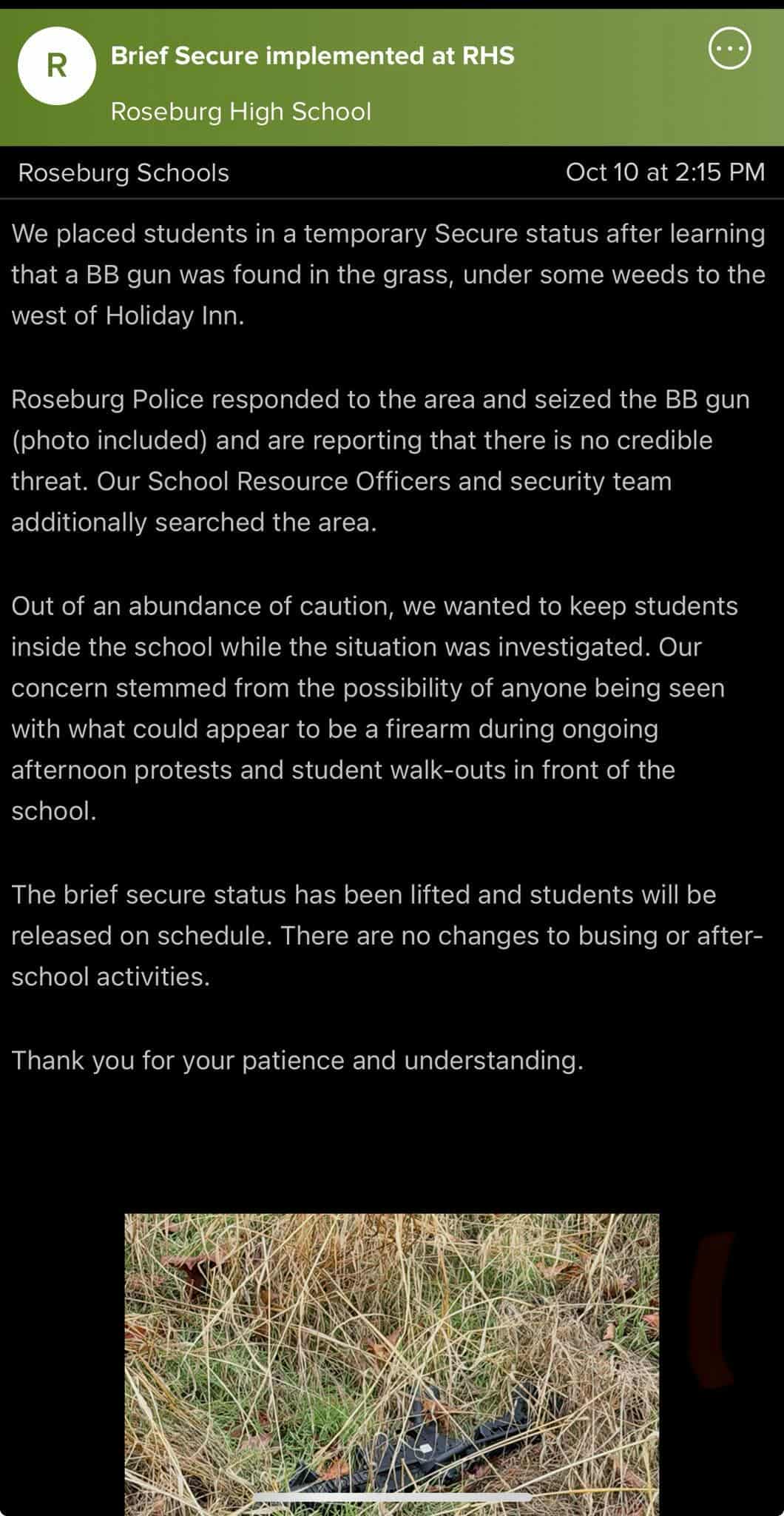 The incident occurred around 2:15 p.m. after staff were alerted to a BB gun found in the grass under some weeds just west of the Holiday Inn, near the school. Roseburg Police responded promptly, seized the item, and confirmed there was no credible threat to students or staff. School Resource Officers and the security team also conducted a thorough search of the area.