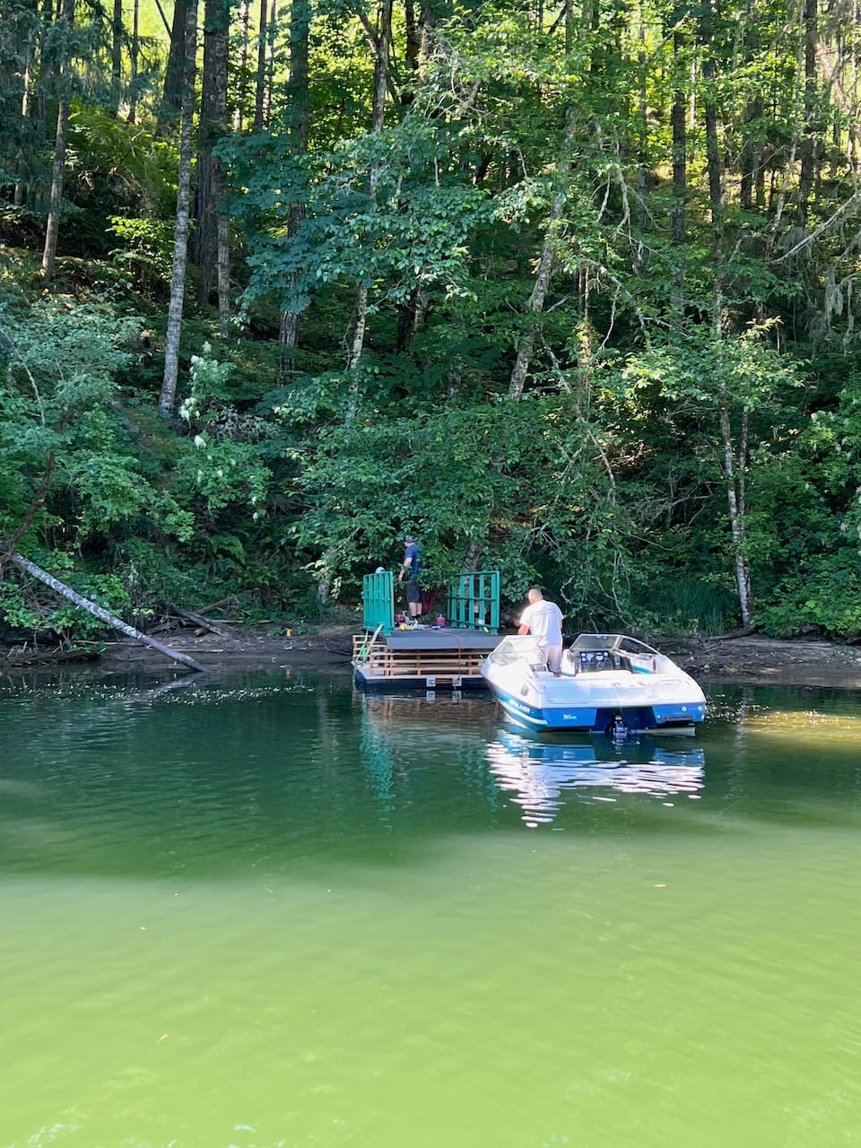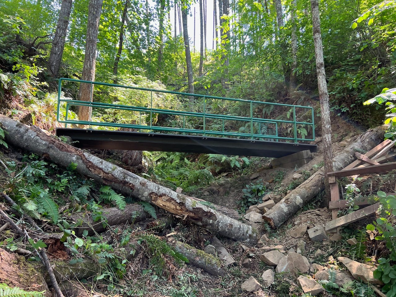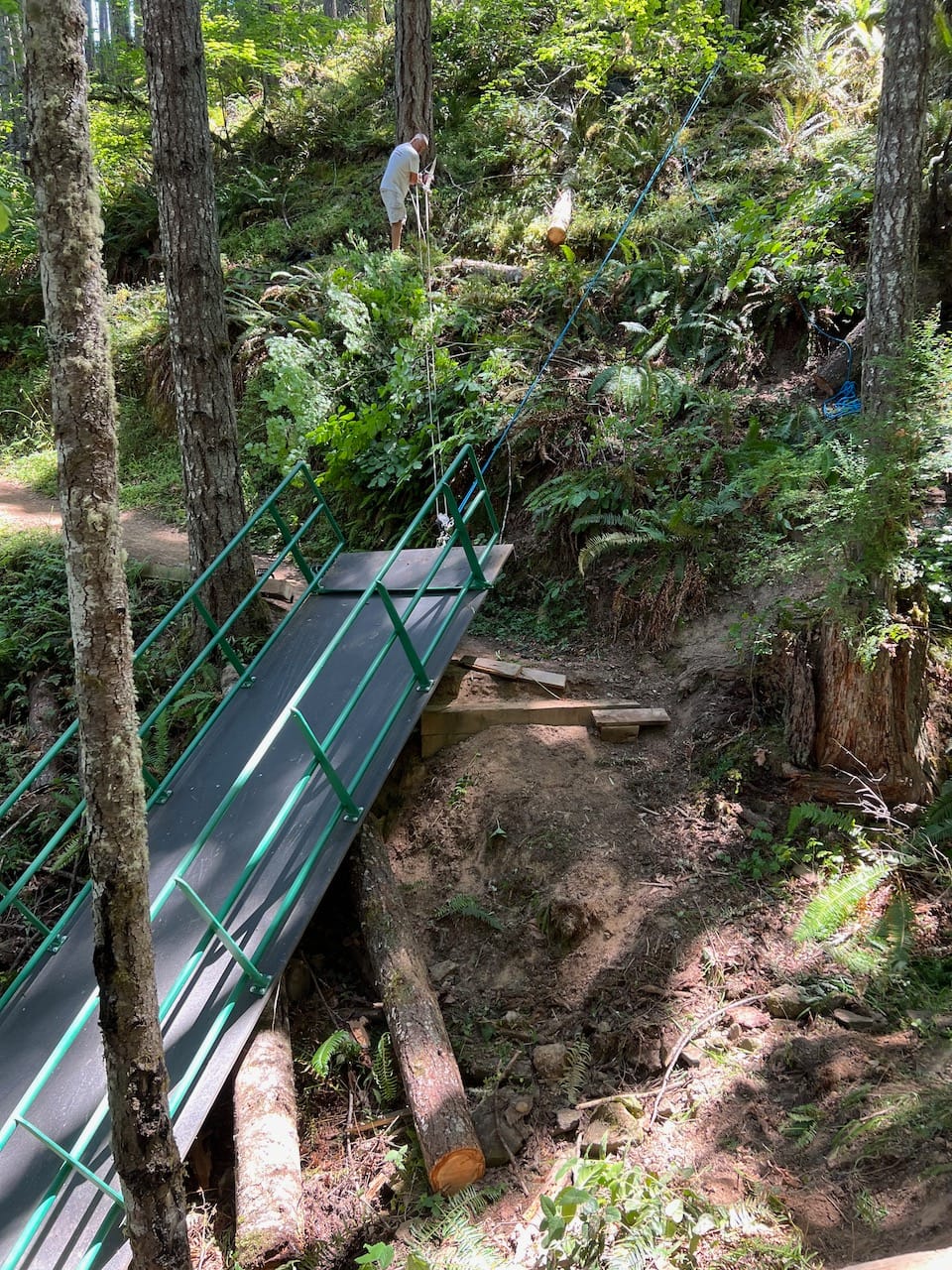 “The new bridge at Cooper Creek was installed today! A big shout out to Eric Ball and his crew from Orenco. They did an awesome job of floating the bridge out and winching it into place.”