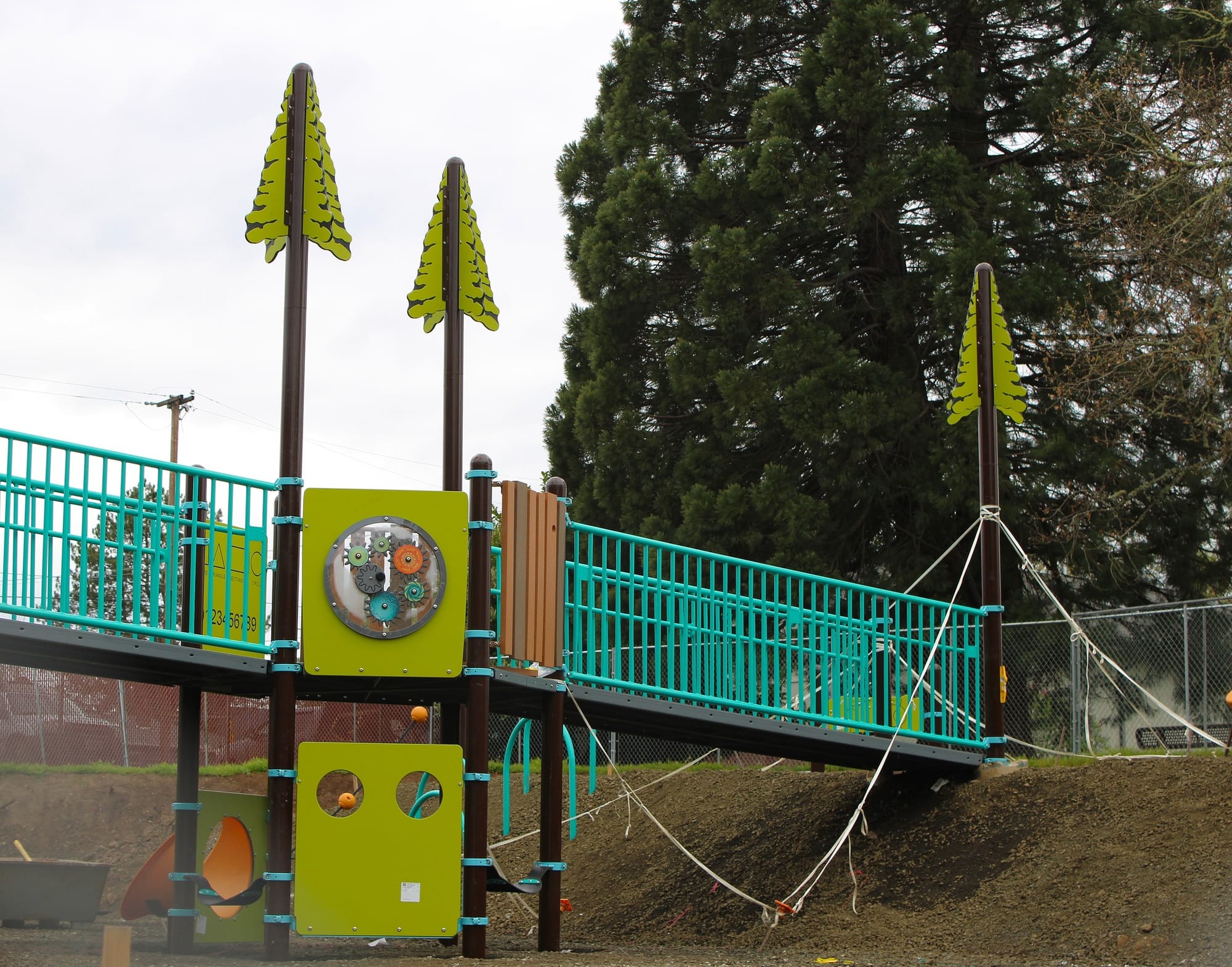 When finished, the park will feature separate play areas for younger children and older kids, along with accessible routes and equipment meant to encourage shared play. Planned features include sensory panels, an inclusive swing, a wheelchair-accessible merry-go-round, a multi-seat teeter-totter, shaded picnic space, benches, artificial turf surfacing and landscaped natural areas.
