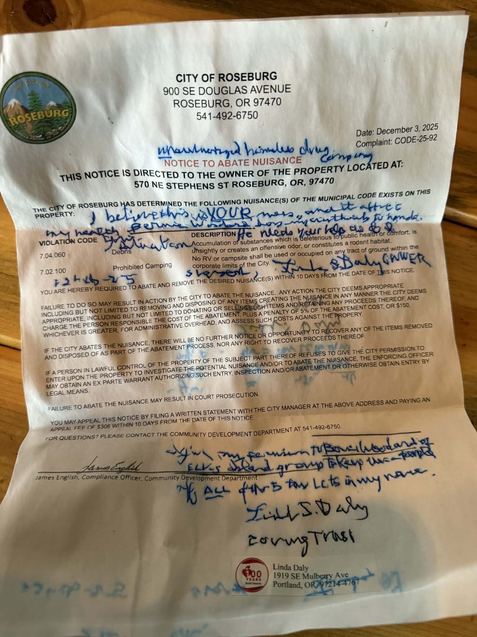The notice, dated December 3, 2025, was issued by the City of Roseburg Community Development Department and addressed to Linda Daly, the owner of a property on NE Stephens Street. The notice cites alleged violations for “prohibited camping” and “debris” and warns that failure to correct the issue could result in court prosecution.