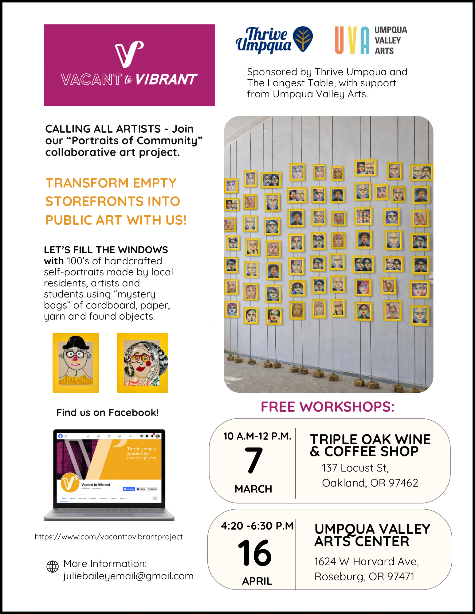 Vacant to Vibrant is hosting free community art workshops in Roseburg and Oakland to create “Portraits of Community,” a public installation filling vacant storefronts this summer. Residents are invited to attend March and April drop-in sessions to help make the art.