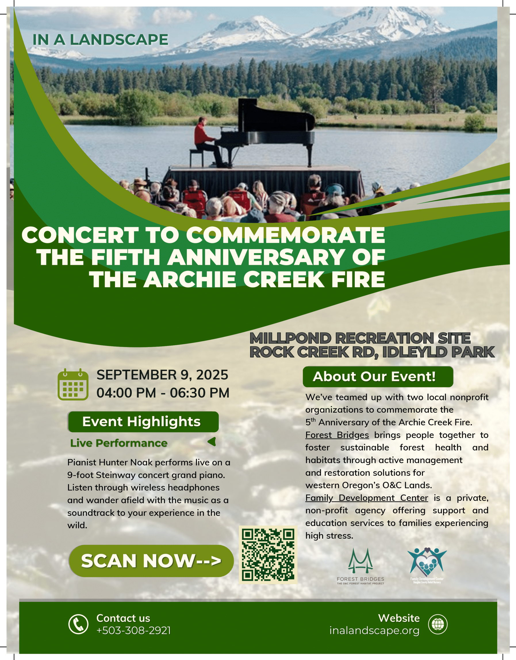 The concert will feature pianist Hunter Noack of In a Landscape and will take place at the Millpond Recreation Site, a poignant location where the Archie Creek Fire burned over 125,000 acres in Douglas County. The fire destroyed 154 homes and left more than half the affected area in an unrestored, severely burned condition.