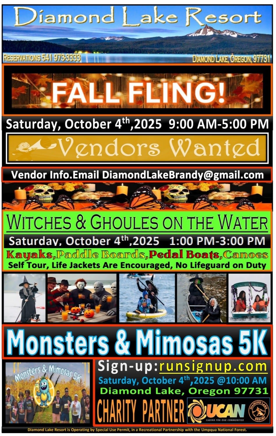 Diamond Lake Resort hosts its first Fall Fling Oct. 4, 9–5! 🎃 Start the day with the Monsters & Mimosas 5K (benefiting UCAN, use code “Diamondlake” for 10% off). Vendors, food, and “Witches & Ghouls on the Water” make it a full day of fun.