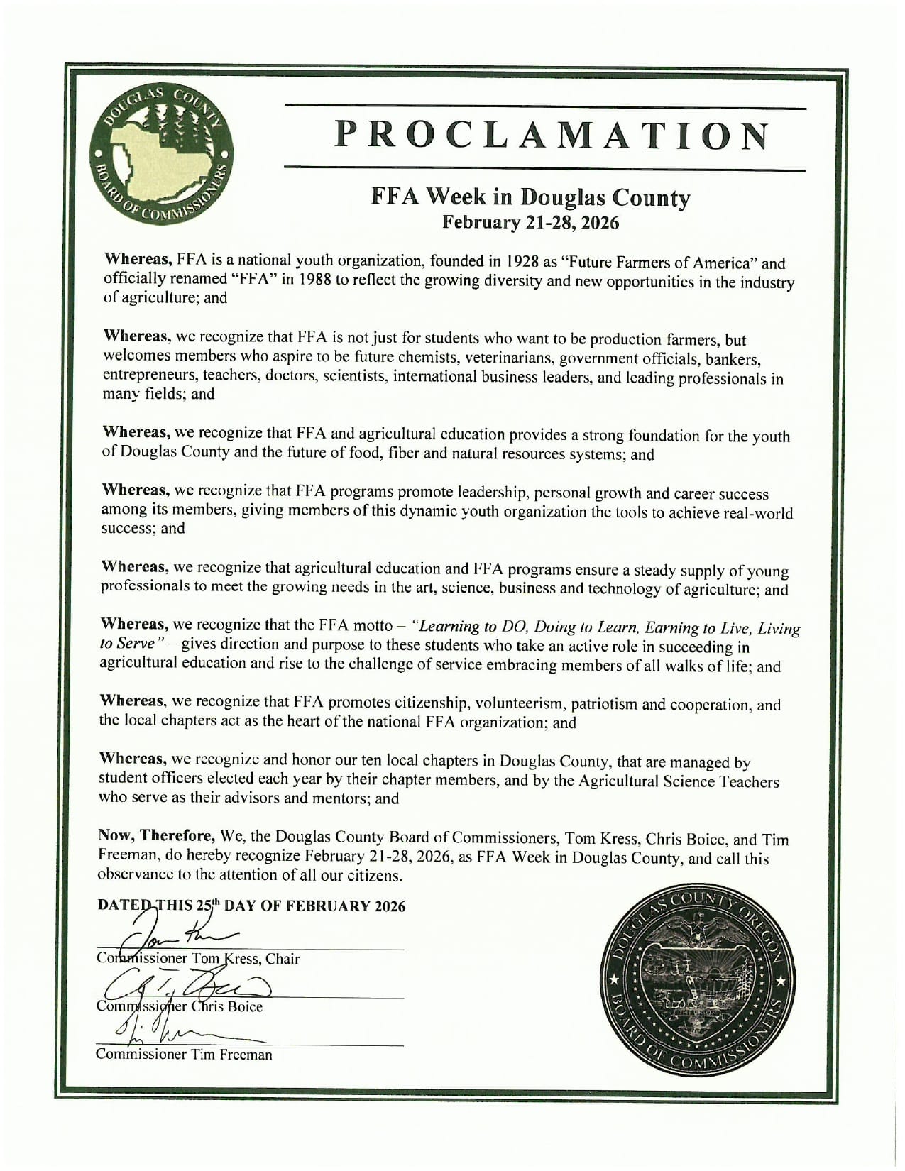 The proclamation was presented during the commissioners’ weekly business meeting on Wednesday, February 25, 2026, at the Douglas County Courthouse. Kress read the proclamation on behalf of the board, emphasizing how FFA helps students build leadership skills and practical experience that carry into careers and community service.