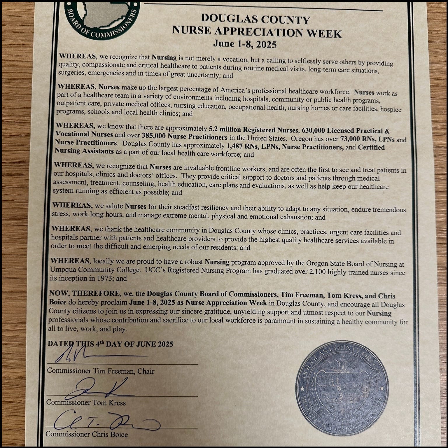 ROSEBURG, Ore. — Nurses across Douglas County received well-deserved recognition this week as the Douglas County Board of Commissioners officially proclaimed June 1–8, 2025, as Nurse Appreciation Week.