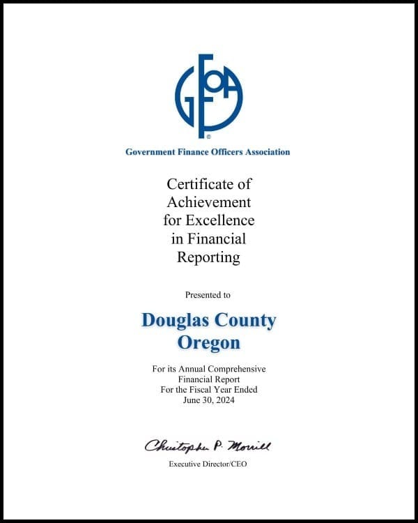 Douglas County Commissioners Tim Freeman, Tom Kress, and Chris Boice recognized Chief Financial Officer Dan Wilson and the Douglas County Management and Finance Department for receiving the Certificate of Achievement for Excellence in Financial Reporting (COA). The award, presented by the Government Finance Officers Association (GFOA) of the United States and Canada, honors the department’s Annual Comprehensive Financial Report (ACFR) for the fiscal year ending June 30, 2024. The report is available on the Douglas County website at: https://douglascountyor.gov/620/ACFR.