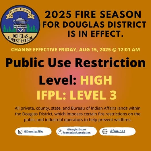 The Public Use Restrictions (PURs) will shift to HIGH for all private, county, state, and Bureau of Indian Affairs lands within the Douglas District. While the adjustment reflects improved conditions, DFPA emphasizes that fire season is not over. Expected rainfall over the weekend will not be enough to end the risk.