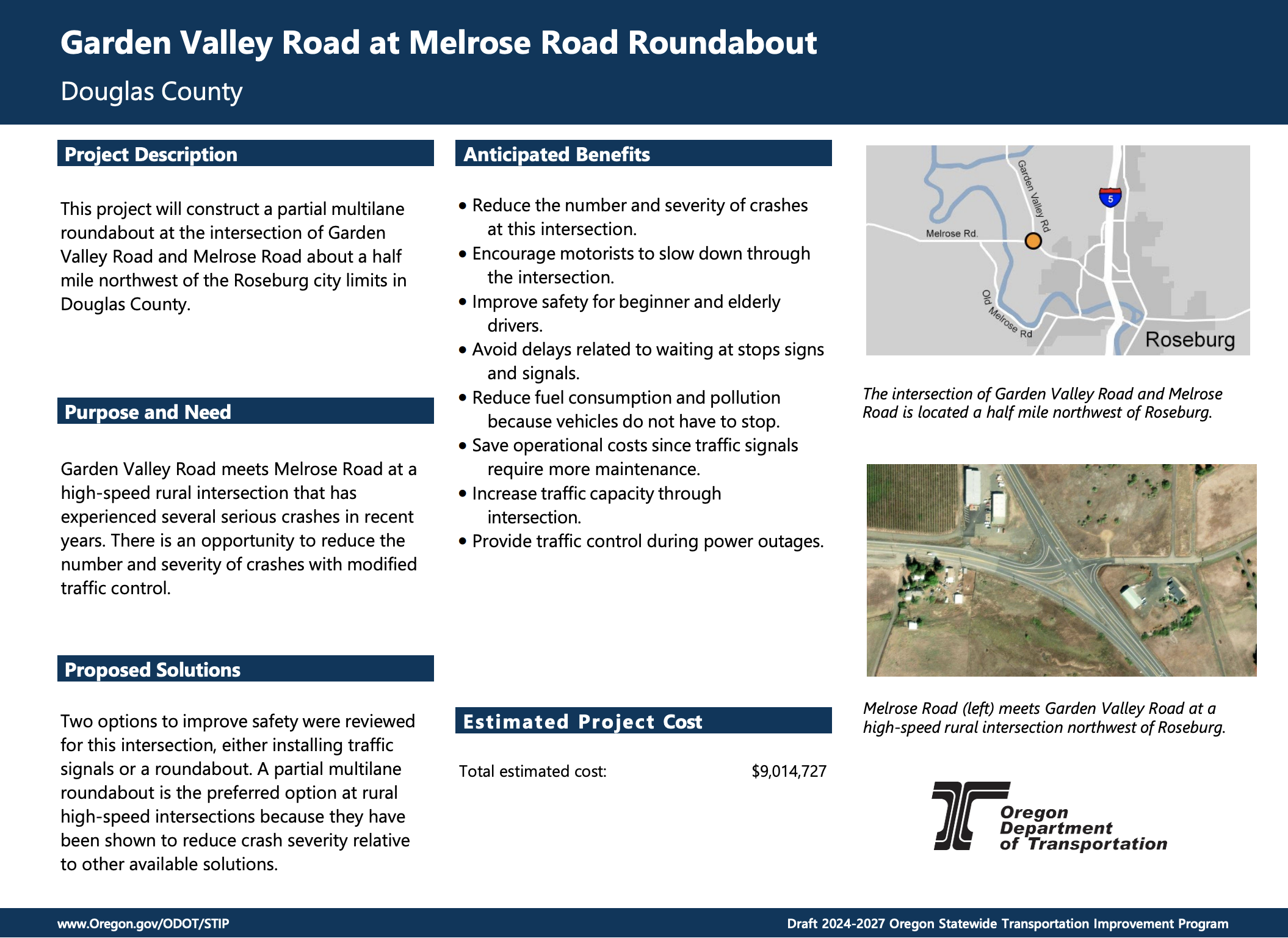 Douglas County's $9M project will construct a partial multilane roundabout at Garden Valley and Melrose Road, reducing crash severity, improving traffic flow, and enhancing safety for all drivers at this high-risk intersection northwest of Roseburg.