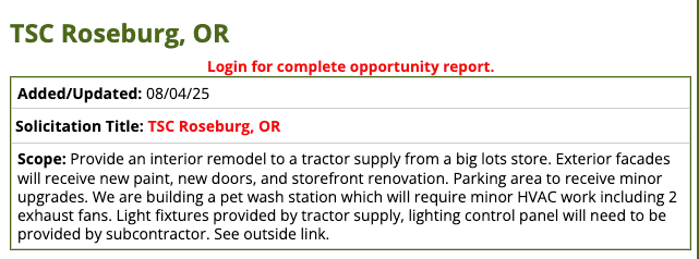 In addition to the lease purchase, construction bid documents and commercial project listings now reference a “Tractor Supply – Roseburg” mercantile space renovation. These listings typically appear shortly before interior buildouts begin, which suggests work may be moving forward at the NE Stephens site.