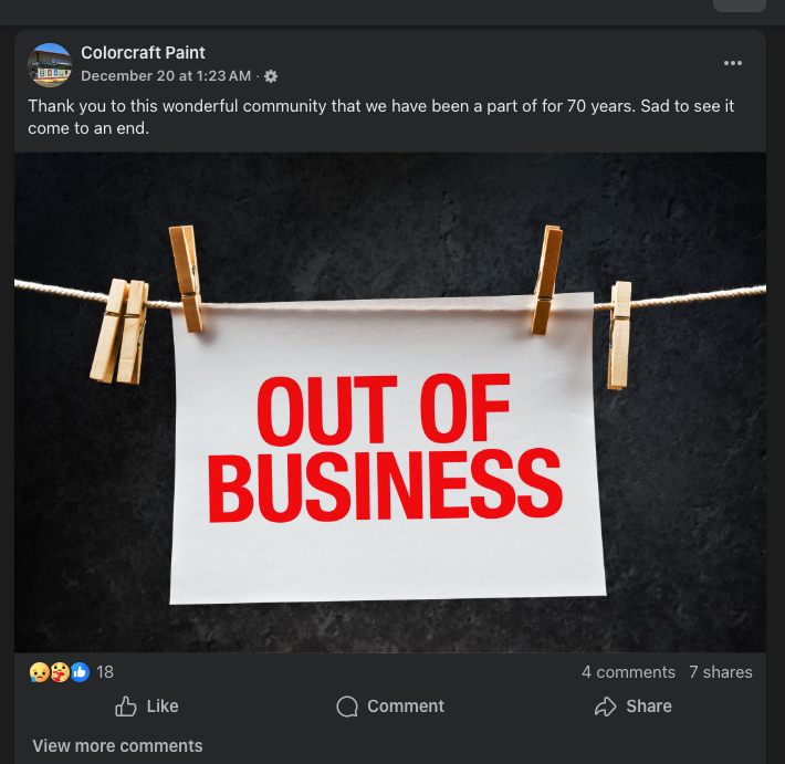 LOCAL BUSINESS CLOSURE – COLORCRAFT PAINT