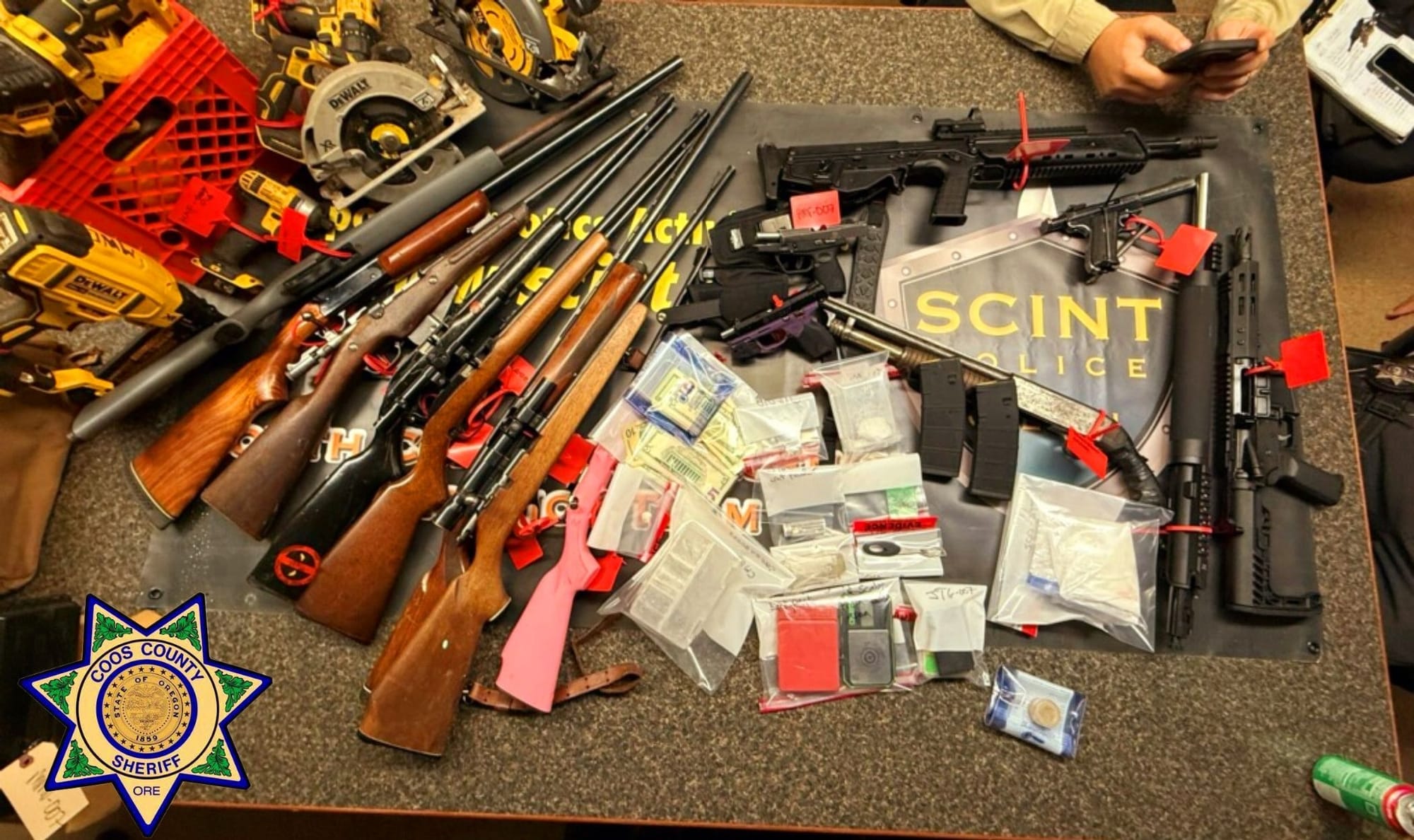 - 13 firearms, including one confirmed stolen from the Coos Bay area.