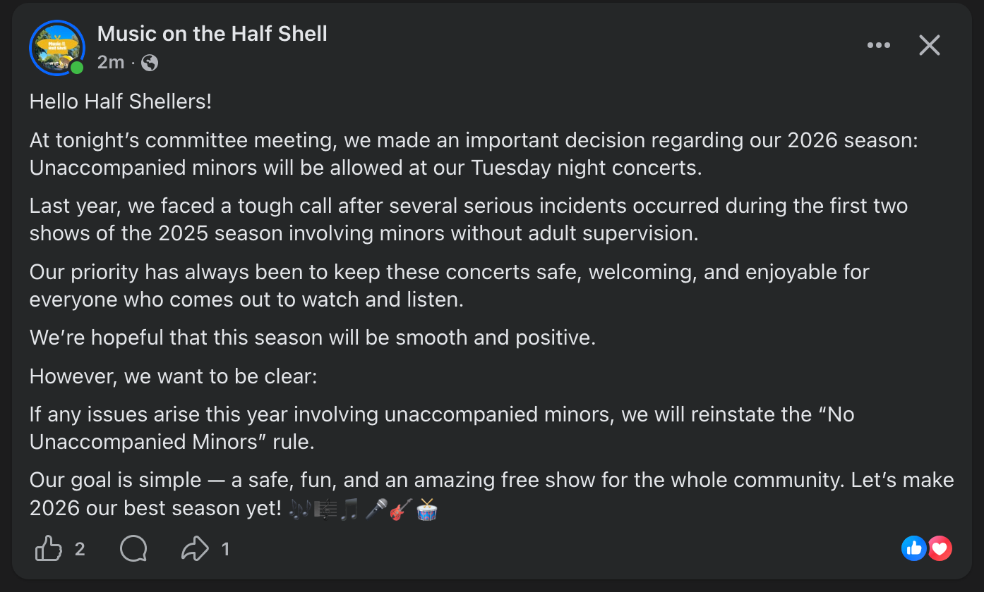 Music on the Half Shell announced Tuesday that unaccompanied minors will be allowed at its Tuesday night concerts during the 2026 season, a shift from restrictions put in place after incidents involving unsupervised youth during the start of the 2025 season.