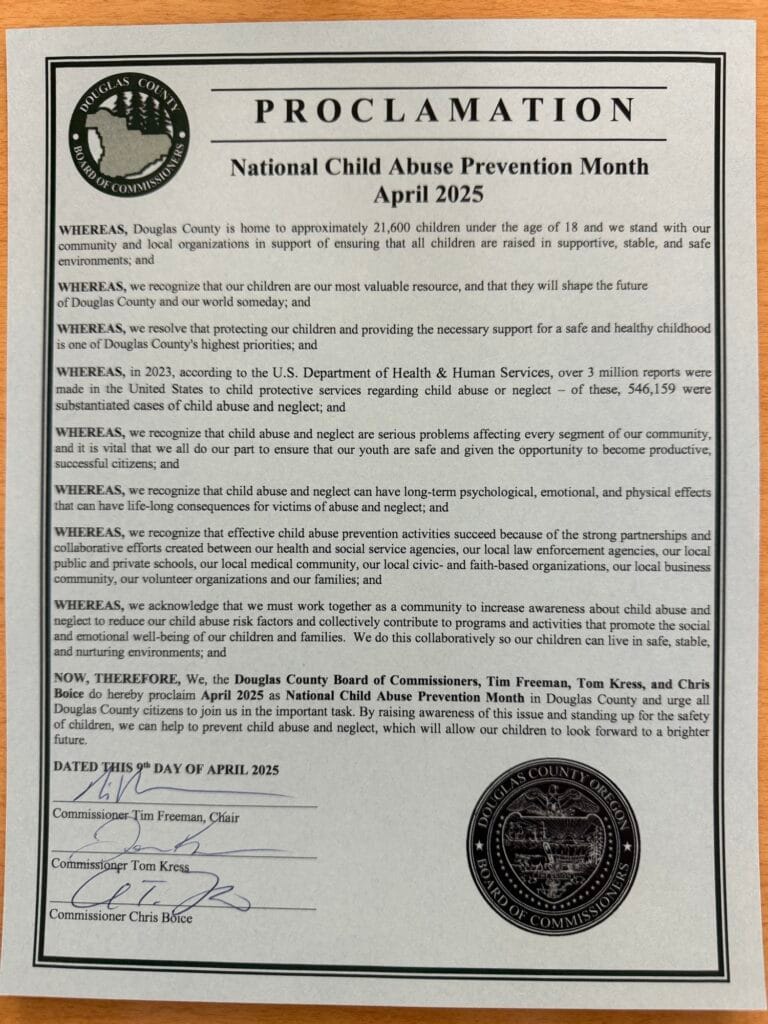 On Wednesday, Douglas County Commissioners Tim Freeman, Tom Kress and Chris Boice issued a proclamation in honor of National Child Abuse Prevention and Awareness Month during their weekly business meeting.