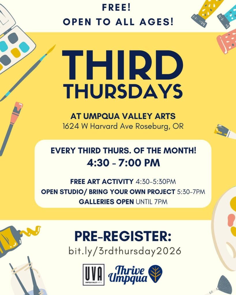 Thrive Umpqua will host its Third Thursday event Thursday from 4:30 p.m. to 6:30 p.m. at the Umpqua Valley Arts Center on West Harvard Avenue in Roseburg.