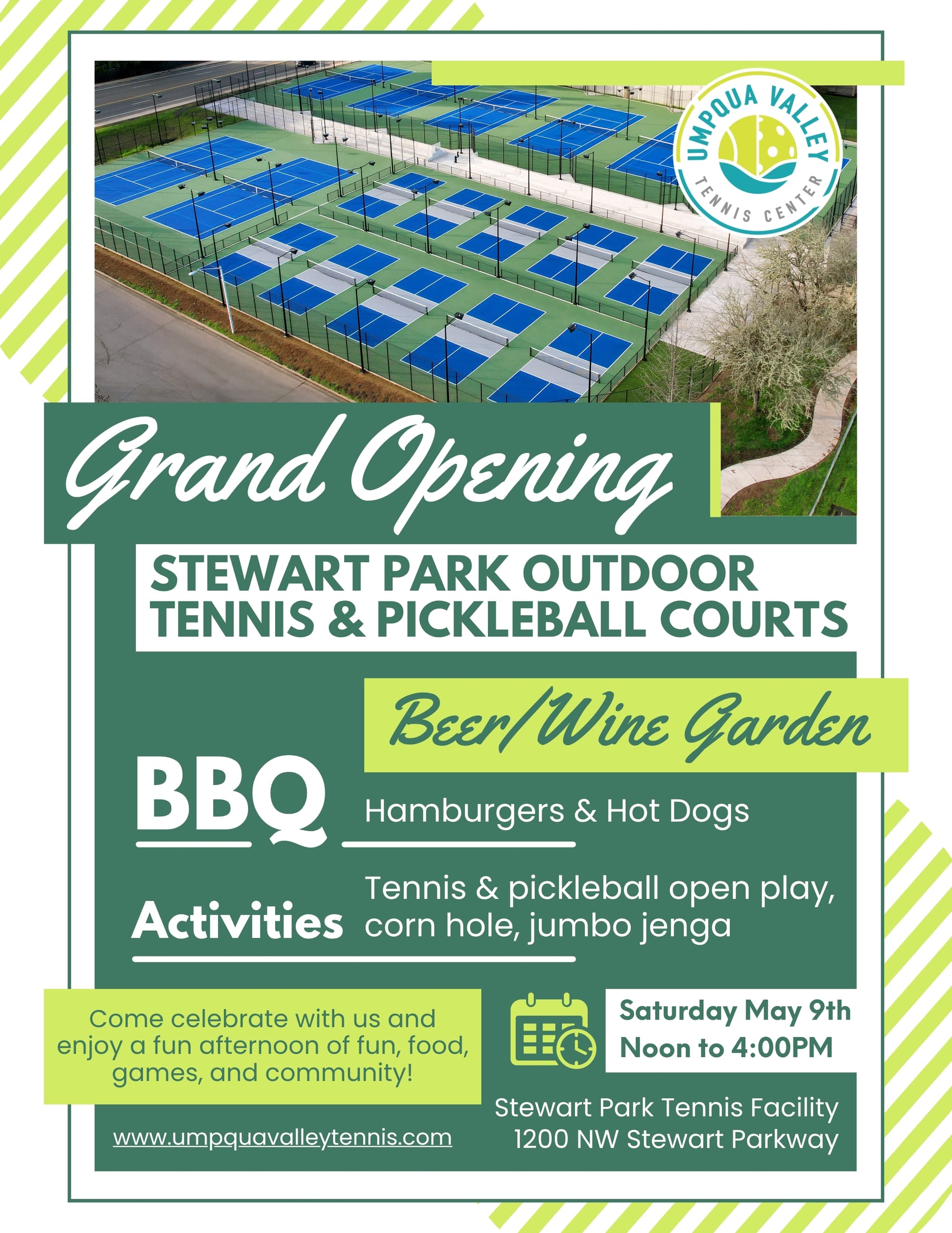 ROSEBURG, Ore. — The Umpqua Valley Tennis Center is inviting the public to celebrate the official grand opening of Roseburg’s newly renovated outdoor tennis and pickleball complex with a free community event on Saturday, May 9.