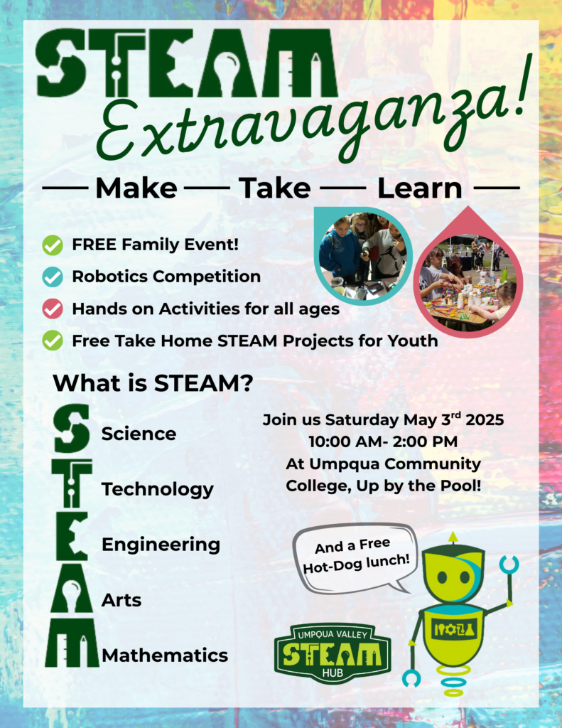 The event will take place on Saturday, May 3rd from 10:00 a.m. to 2:00 p.m. outside near the pool at Umpqua Community College. The free family event will include a robotics competition and hands-on activities for all ages. There will be free take home STEAM projects for youth as well. A free hot dog lunch will also be served.