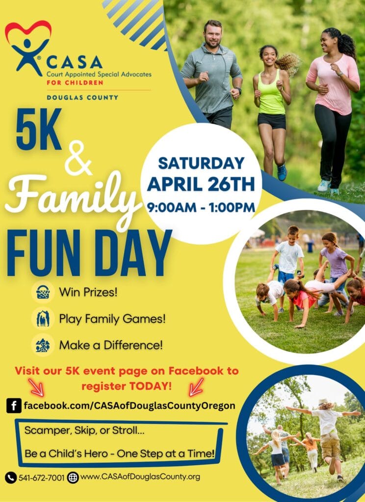 The 5K race will begin at 10:00 a.m. with registration opening at 8:30 a.m. Pre-registration can take place in advance through a link on the Casa of Douglas County Facebook page: https://www.facebook.com/CASAofDouglasCountyOregon. Participants can run, jog or walk the scenic 5K route. Families not participating in the race can enjoy a variety of activities including games, face painting, a craft tent and more.