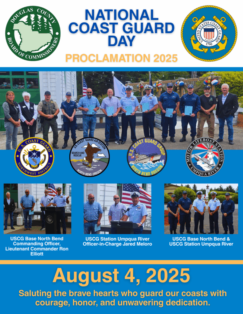 On Wednesday, Douglas County Commissioners Tim Freeman, Tom Kress, and Chris Boice were on location in Winchester Bay for a special presentation for National Coast Guard Day and National Lighthouse Day and Week.
