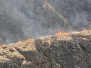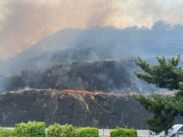 The fire was reported shortly before 7:00 p.m. with flames seen along Interstate 5 near the southbound on-ramp from West Harvard Avenue and quickly moving up the mountain. A DFPA helicopter did multiple water bucket drops on the fire while a plane from the agency flew in the area to monitor where the fire was headed. At around 7:30 p.m. smoke from the fire was thick along the freeway making it hard for motorists to see, but the road remained open.