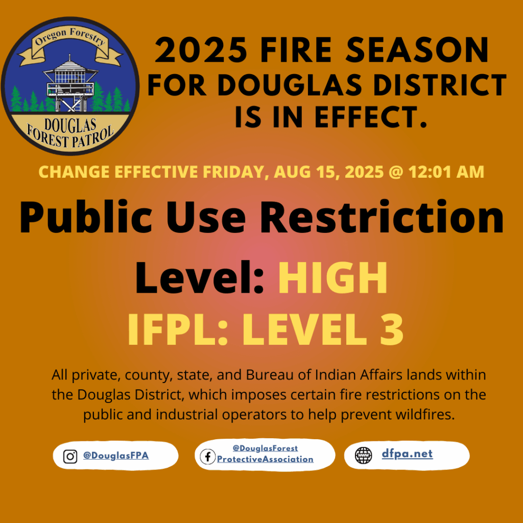 With predicted decreases in temperatures, increases in relative humidity, and greater overnight moisture recovery, the Douglas Forest Protective Association has lowered the Public Use Restriction levels to High, effective Friday.