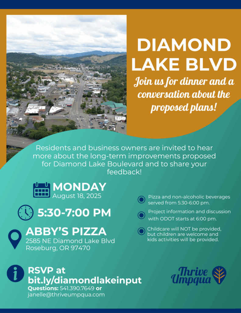 Thrive Umpqua and the Oregon Department of Transportation are inviting the community to dinner and conversation on the future of Diamond Lake Boulevard.