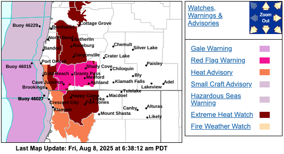 Forecasters at the National Weather Service in Medford said dangerously hot temperatures near 100 to 105 degrees are possible. Very warm overnight temperatures of 65 to 70 degrees are possible as well.
