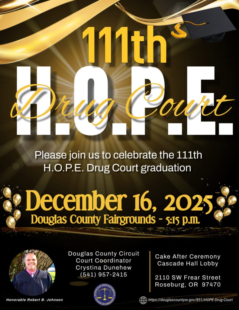 For more information on H.O.P.E. Drug Court, go to: https://www.douglascountyor.gov/851/HOPE-Drug-Court