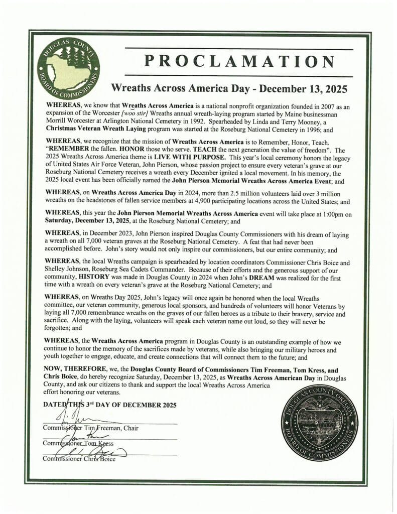 A county release said the mission of the event is to “REMEMBER the Fallen, HONOR Those Who Serve and TEACH Out Children the Value of Freedom”, with the laying of wreaths on veteran’s graves on the second or third Saturday of December each year. The commissioners are honored to support the event, especially the efforts of the local community in placing wreaths on veteran’s graves at the Roseburg National Cemetery.