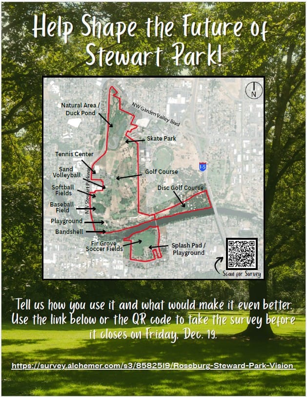 The release said parks staff, Thrive Umpqua and other community partners collaborated to win a $195,000 UHA Community Health Improvement Plan grant to help promote Douglas County resident’s health and well-being through several projects. A total of $25,000 will be used for Phase One of the Stewart Park Master Plan update, which involves the survey.