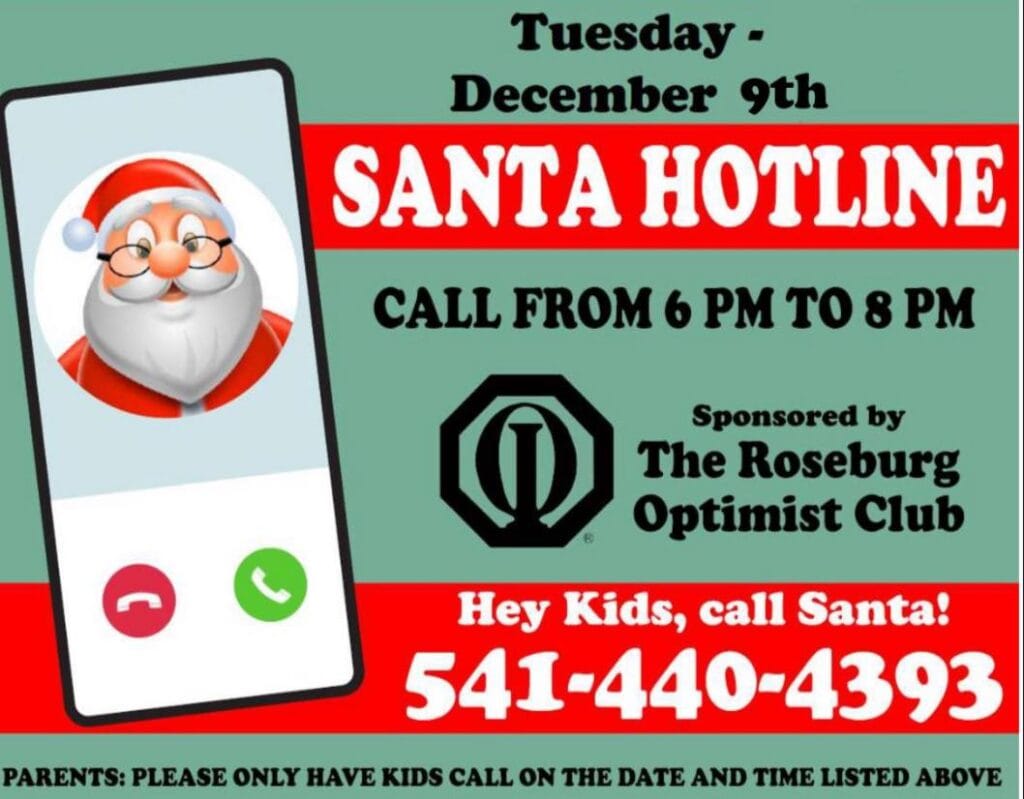 The Roseburg Optimist Club will have its Santa Hotline on Tuesday night.