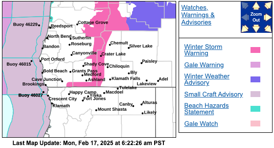 A Winter Storm Warning remains in effect through 4:00 p.m. Monday for mountain areas in parts of southern Oregon.