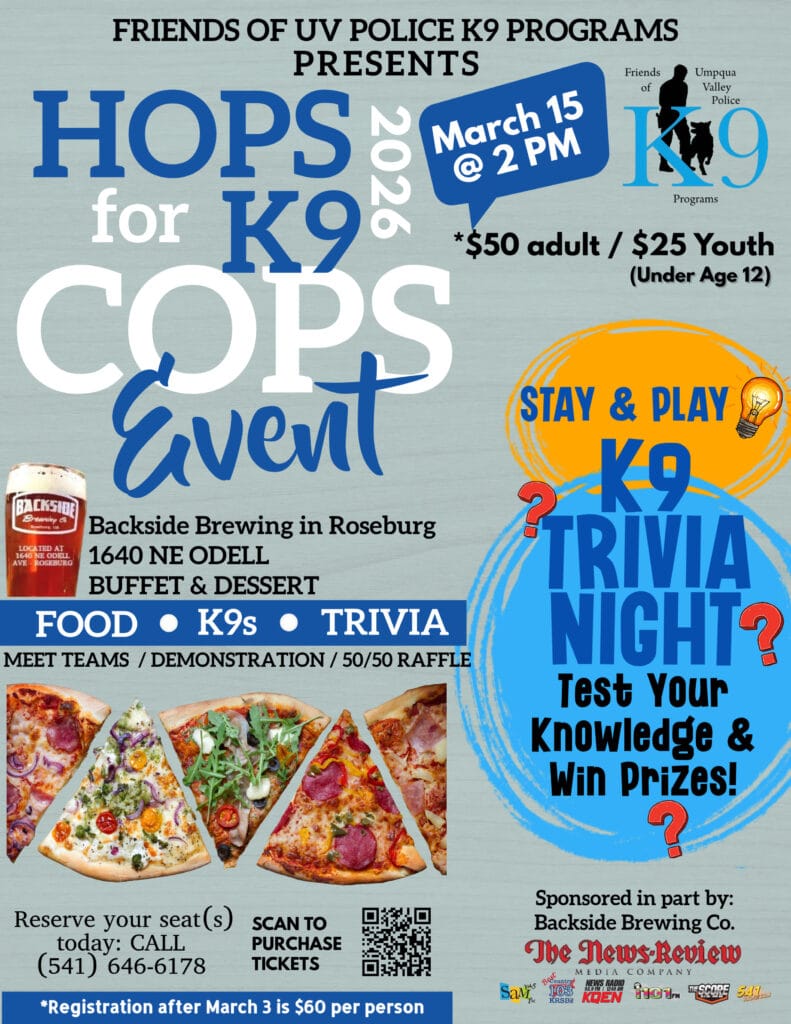 For tickets, go to www.uvk9.org, scan the QR code in the image above, or send a check to Friends of UV Police K9s at post office box 213 in Roseburg, 97470. Anyone with questions can call 541-646-6178.