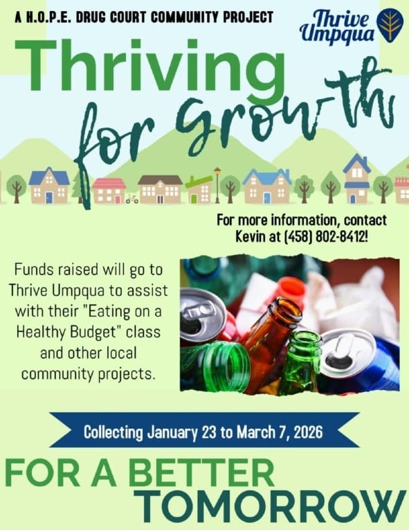 A third component of this project is to assist Thrive Umpqua with the cost of their monthly class for Eating Healthy on a Budget to support individuals utilizing the Progress Point facility operated by Adapt Integrated Health Care. To help fund the class, a community can and bottle drive is underway.