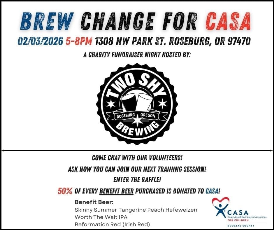 The fundraiser will take place on February 3 from 5 to 8 p.m. at Two Shy Brewing, located at 1308 NW Park Street in Roseburg. The evening will feature designated benefit brews, a raffle, and opportunities for community members to learn more about CASA’s work advocating for children who have experienced abuse or neglect.