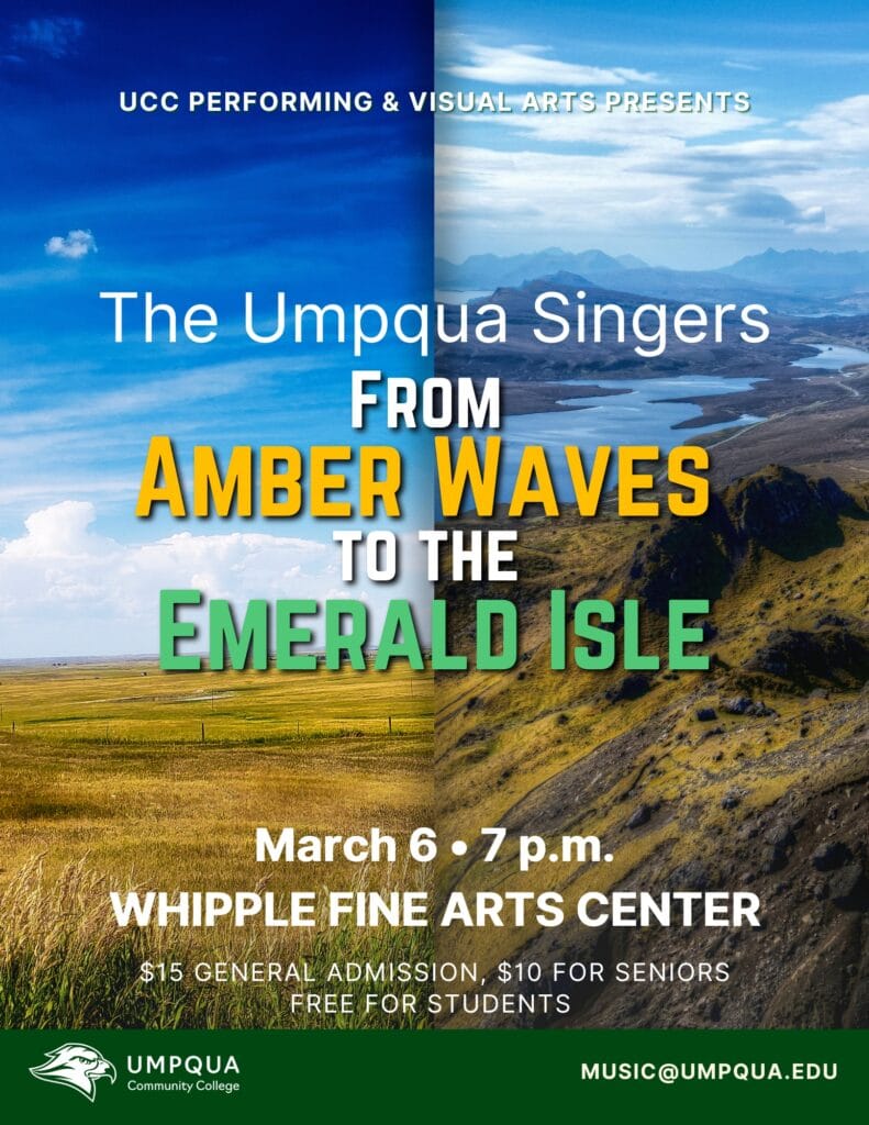 The Umpqua Singers, directed by Dr. Jason Heald, will present “From Amber Waves to the Emerald Isle”. This will be the final performance before their upcoming tour of Ireland.