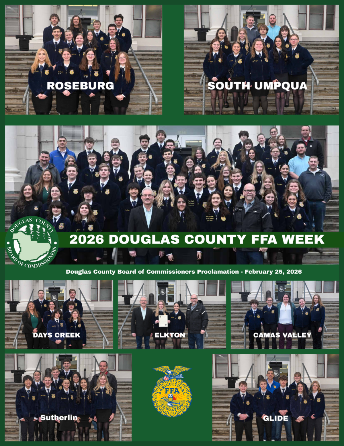 Douglas County’s FFA chapters include Camas Valley, Days Creek, Douglas, Elkton, Glendale, Glide, Oakland, Roseburg, South Umpqua and Sutherlin. Officials said more than 1,200 local youths participate each year in FFA competitions, livestock rearing and leadership programs.