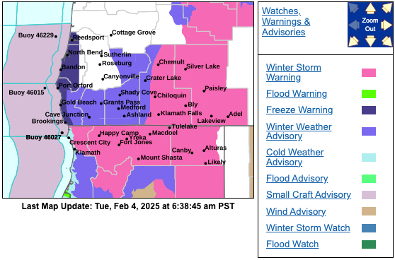 The Advisory area includes the southern Oregon Cascades and Siskiyou Mountains. It applies to Diamond Lake, Crater Lake, Highway 140 at Lake of the Woods and Interstate 5 on the Siskiyou Summit.