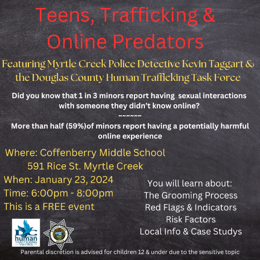 A presentation titled Teens, Trafficking & Online Predators will feature Myrtle Creek Police Detective Kevin Taggart and other members of the task force. It will be held on Wednesday, January 23rd from 6:00 p.m. to 8:00 p.m. at Coffenberry Middle School on Rice Street.