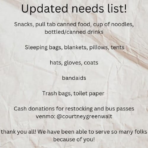 The day warming center is seeking additional donations: snacks, pull-tab canned food, Cup of Noodles instant soup, bottled or canned drinks, sleeping bags, tents, blankets, pillows, hats, coats, gloves and more. Cash can be contributed as well.