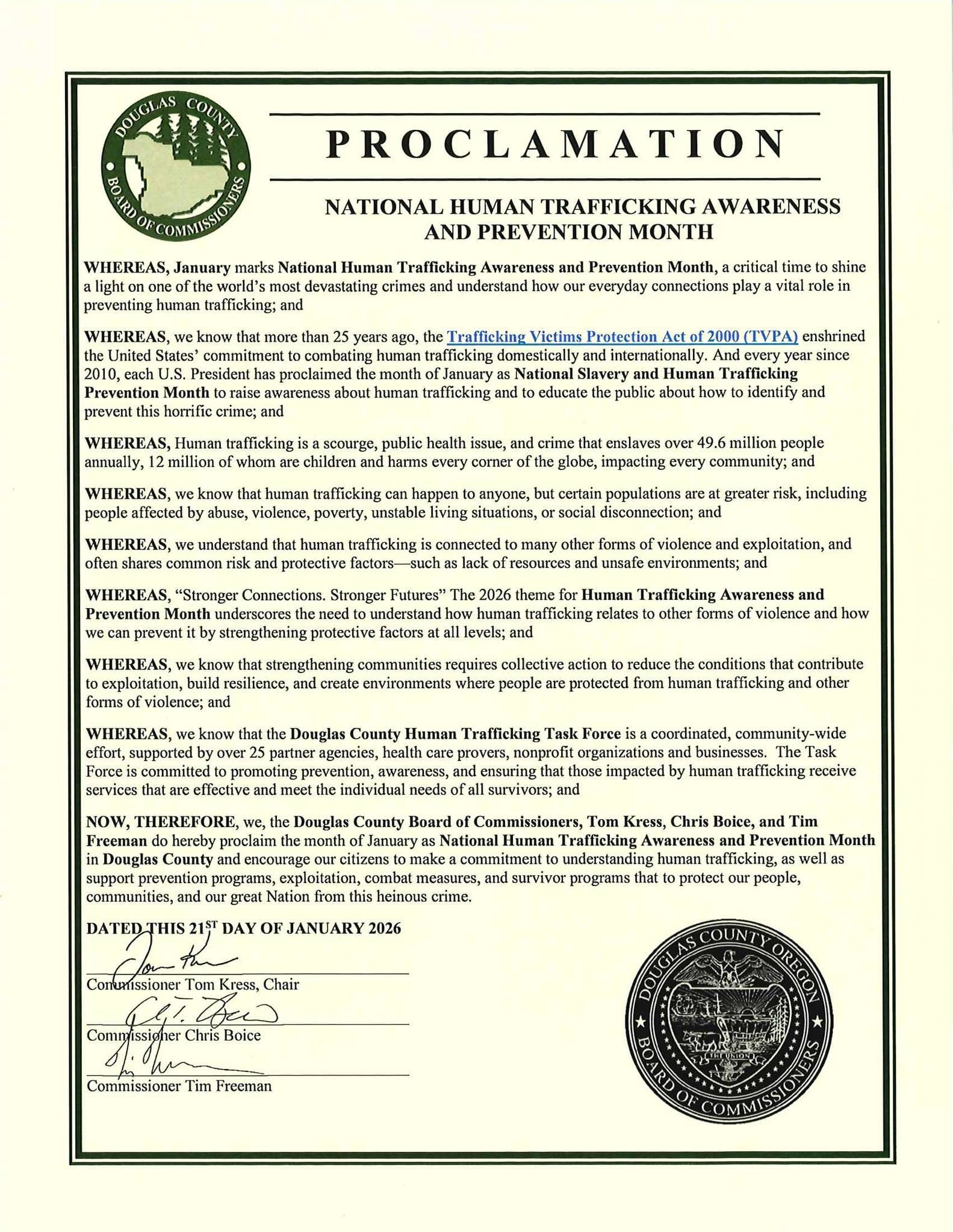 The proclamation also recognizes the Douglas County Human Trafficking Task Force, describing it as a coordinated community-wide effort supported by more than 25 partner agencies, health care providers, nonprofit organizations and businesses.