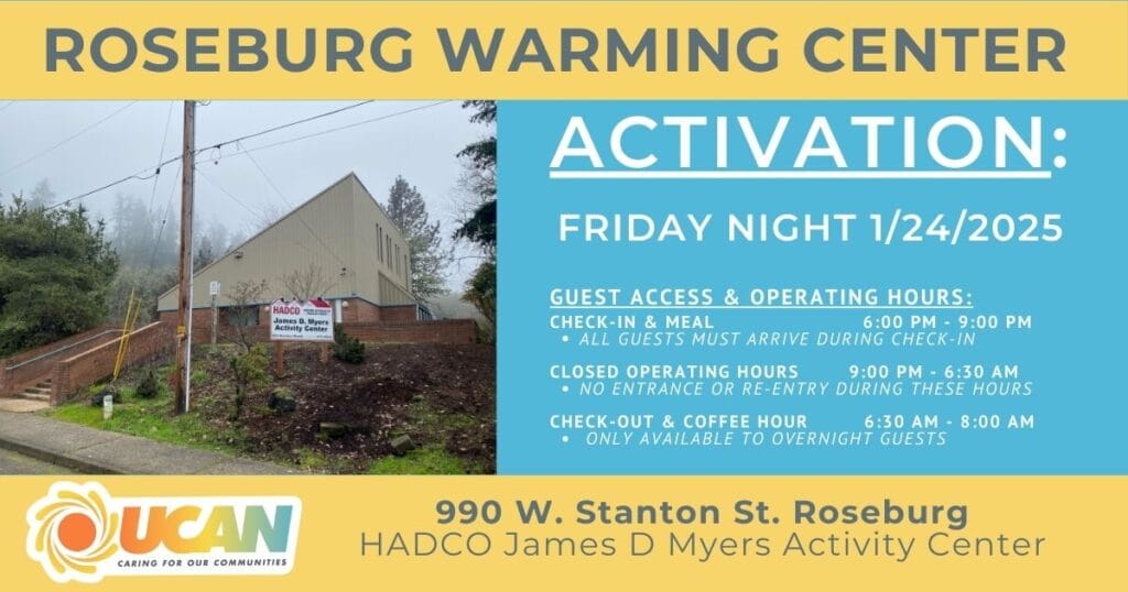 For updates on the Roseburg Warming Center, go to the United Community Action Network Facebook page: https://www.facebook.com/UnitedCommunityActionNetwork