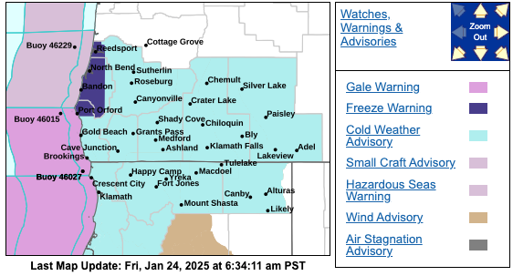 A Cold Weather Advisory is in effect from 10:00 p.m. Friday through 10:00 a.m. Sunday for a wide area in southern Oregon.
