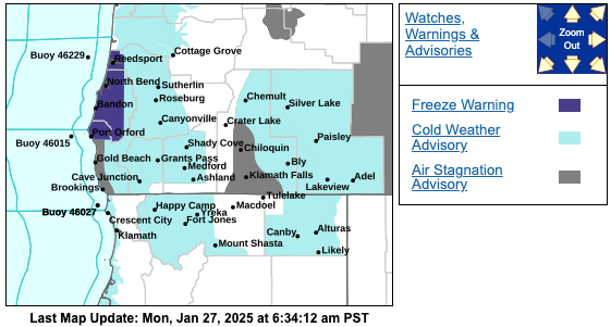 A Cold Weather Advisory remains in effect through 10:00 a.m. Monday for much of southern Oregon.