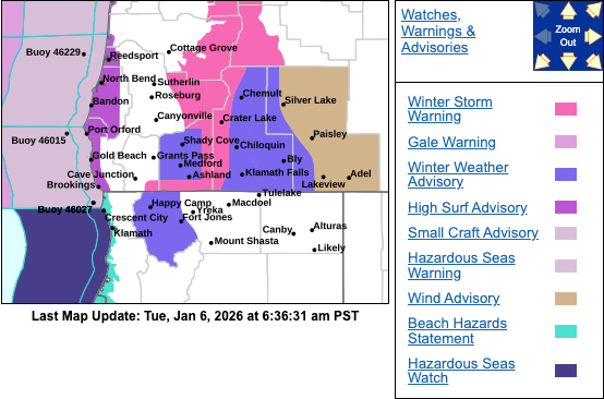 The Warning area includes the southern Oregon Cascades and Siskiyou Mountains including Diamond Lake, Crater Lake, Lake of the Woods, and Siskiyou Summit along with highways 138, 230, 140, 62 down to Union Creek, 66 and Interstate 5.