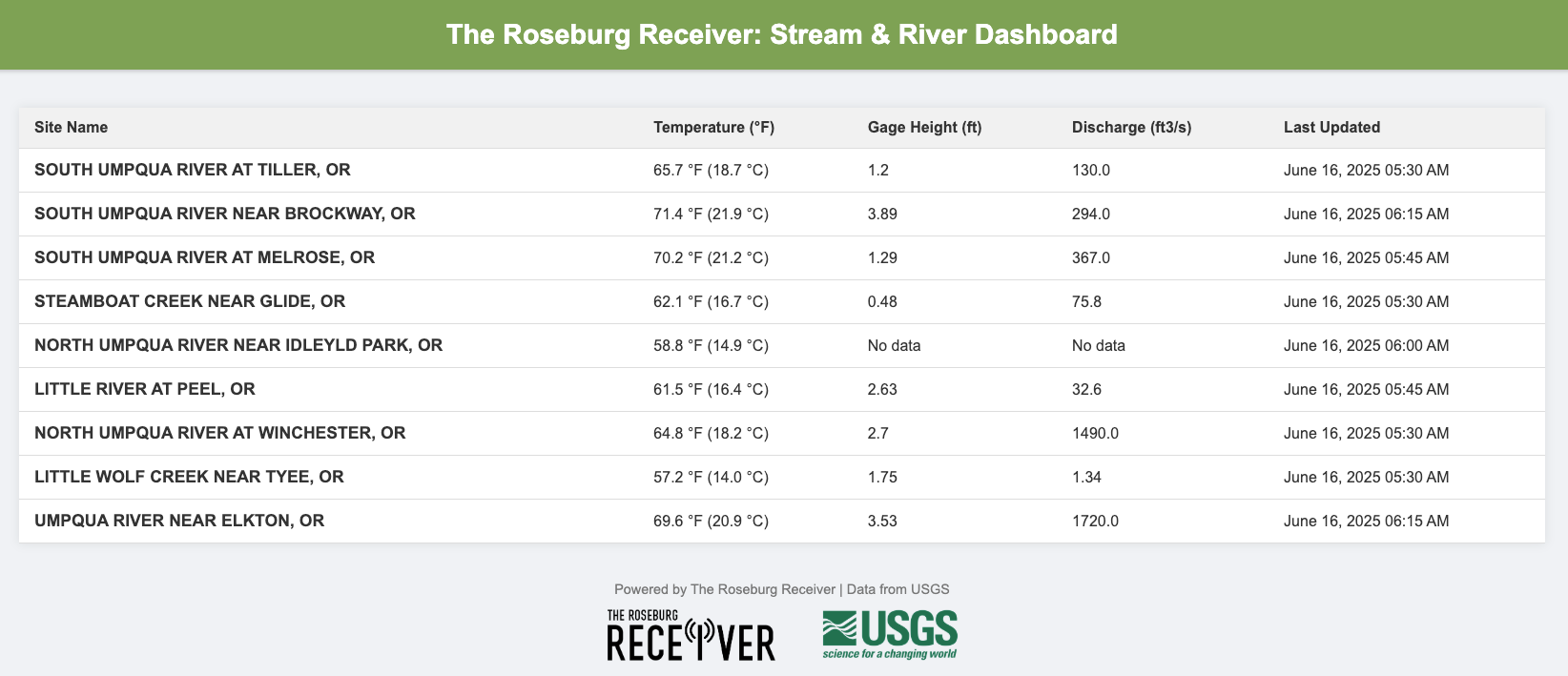 - There is now a website available that has river information such as temperature, gage height, and discharge. It can be accessed by going to https://river.roseburgscanner.com.