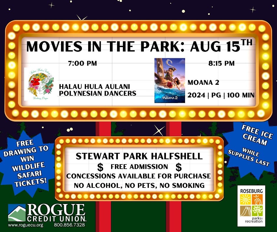 Roseburg Parks and Recreation cosponsors the free series with Rogue Credit Union, which will offer free ice cream at the event while supplies last. Some free tickets to drive through at Wildlife Safari will be given away.
