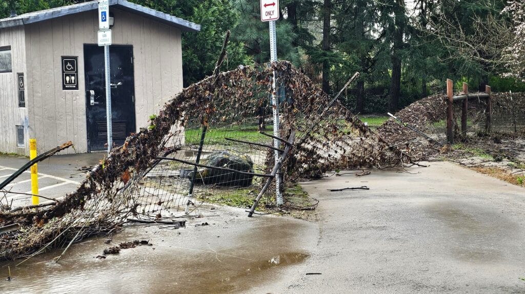 The dog park has been temporarily closed after suffering damage from flooding by the South Umpqua River during record rainfall on March 16th. The fencing around the park was completely destroyed and the flood left water and debris in the park.