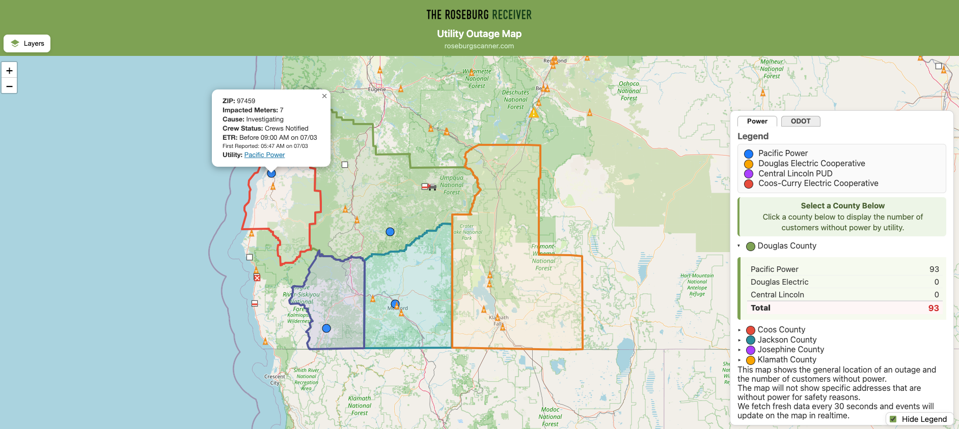 - There is now a site that displays utility outages in Douglas County. This map includes power outages, ODOT incidents, ODOT traffic cameras, and ODOT message signs. We hope to add other utilities other than power in the near future. It can be accessed by going to https://outages.roseburgscanner.com.