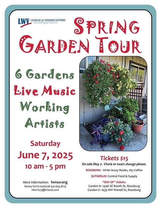 The Spring Garden Tour is a fundraiser for League of Women Voters of Umpqua Valley. For more information about the event, go to: https://lwvuv.org/events/spring-garden-tour-2025/, or call 643-9587.