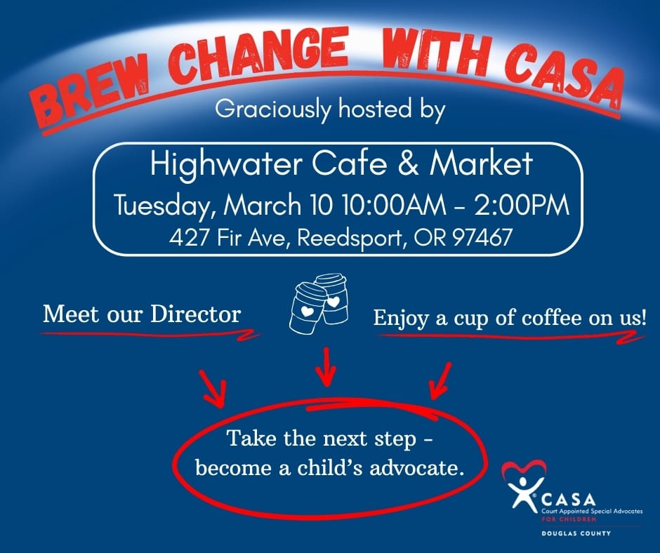 CASA of Douglas County is inviting community members to stop by Highwater Cafe & Market in historic downtown Reedsport on Tuesday, March 10, to learn more about how local volunteers support children in foster care.